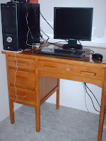 Essa escrivaninha que uso como mesa do computador, ganhei de uma grande amiga. Ficou muitos anos coberta com um plástico, pois tinha manchas de tinta e seu estado era péssimo. Até que um dia resolvi levar para um restaurador, pena que não tirei foto antes.